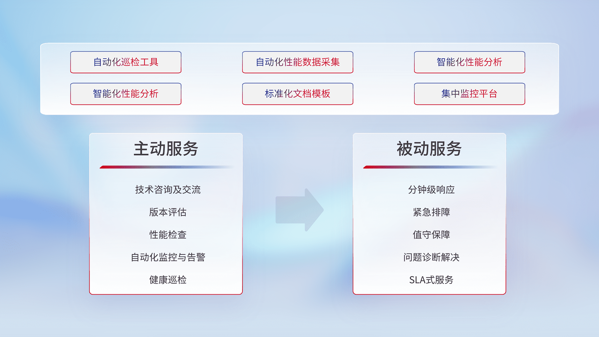 智能化工具和标准化文档,,,保障服务质量,,提供主动服务(包含技术咨询、、、版本评估、、性能检查、、自动化监控与告警、、、健康巡检)和被动服务包含(分钟级响应、、、、紧急排障、、、、值守保障、、、问题诊断解决、、、SLA服务)。。