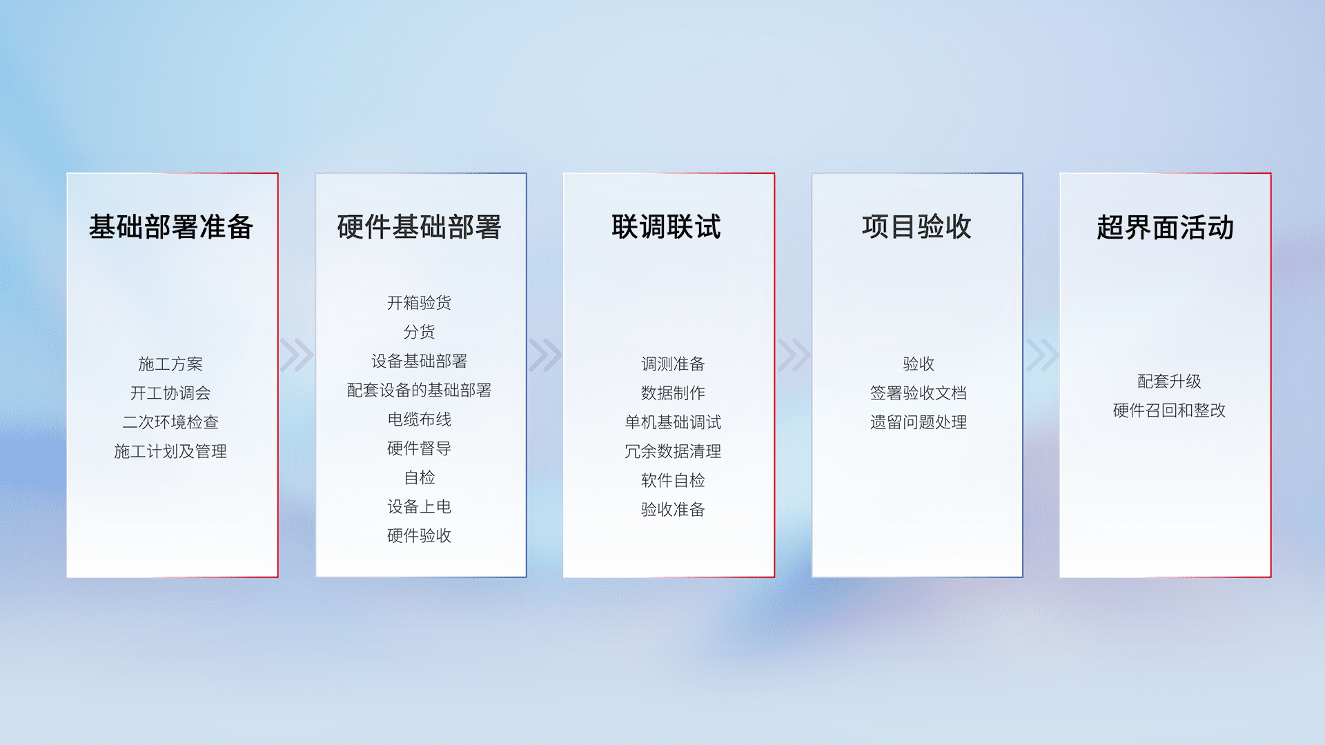 从基础部署准备、、硬件基础部署、、联调联试、、、、项目验收、、、、越界面活动的全过程可追溯,,,保证施工质量和进度。。。。